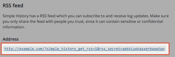 Login to your website and navigate to Settings » Simple History and copy the long RSS-link that you can find there.