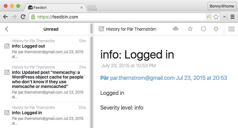 Simple History has built in support for a RSS-feed. By using this RSS-feed you can get updates from your website directly to your phone or computer. What users have logged in, what plugins have been updated, what posts have been created and what posts have been updated?