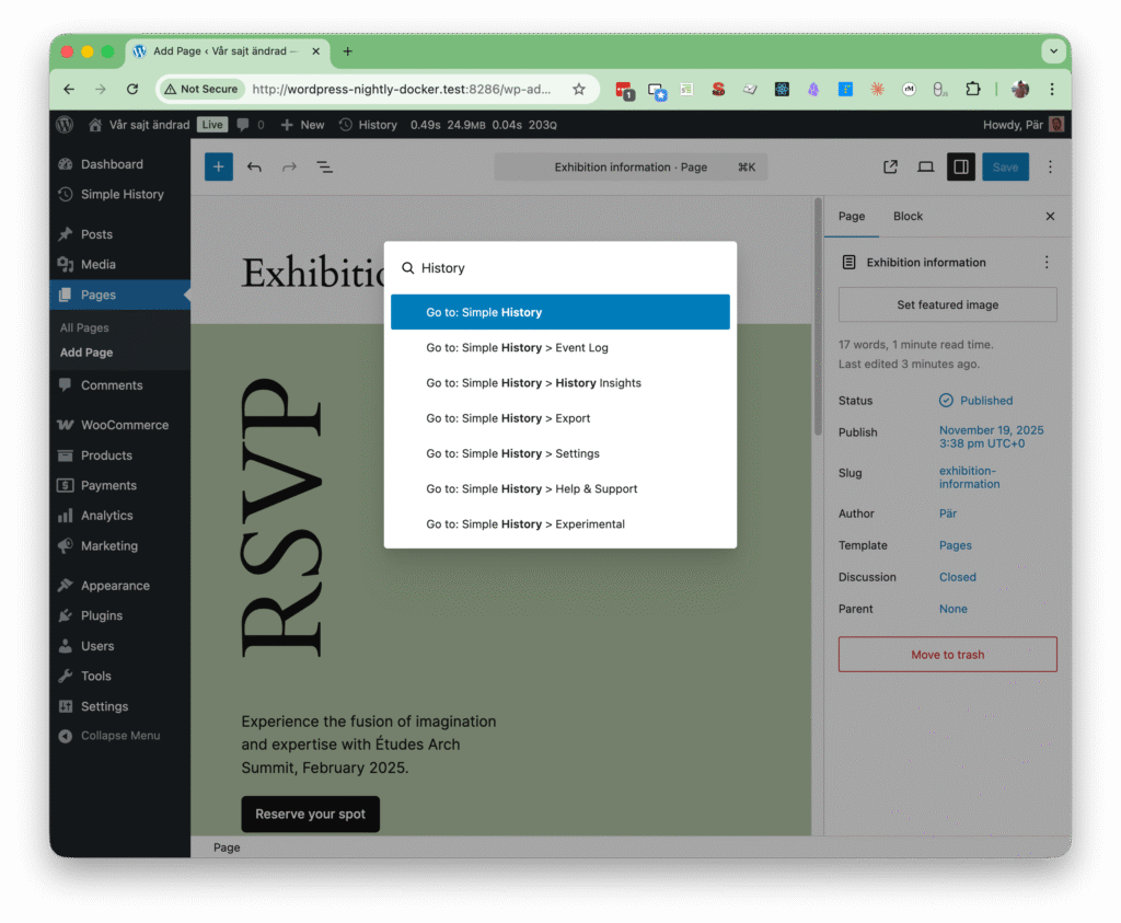 - Enter “History” or “Log” to quickly filter the palette to show nav items related to Simple History