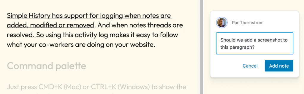First out is a new feature that makes collaboration using WordPress even better: Notes! With notes users can add notes to blocks. It can be comments like suggestions or just a thumps up. Notes are threaded so multiple notes can be added to the same block. Really useful for teams!