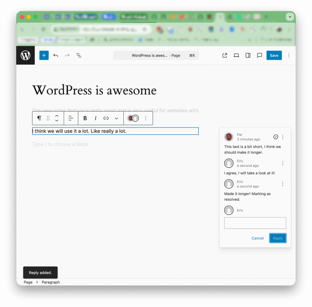 WordPress 6.9, scheduled to be released in december, will among other things add support for notes. With notes a user can add comments – or reply to existing comments – to blocks. These comments can also be marked as resolved.