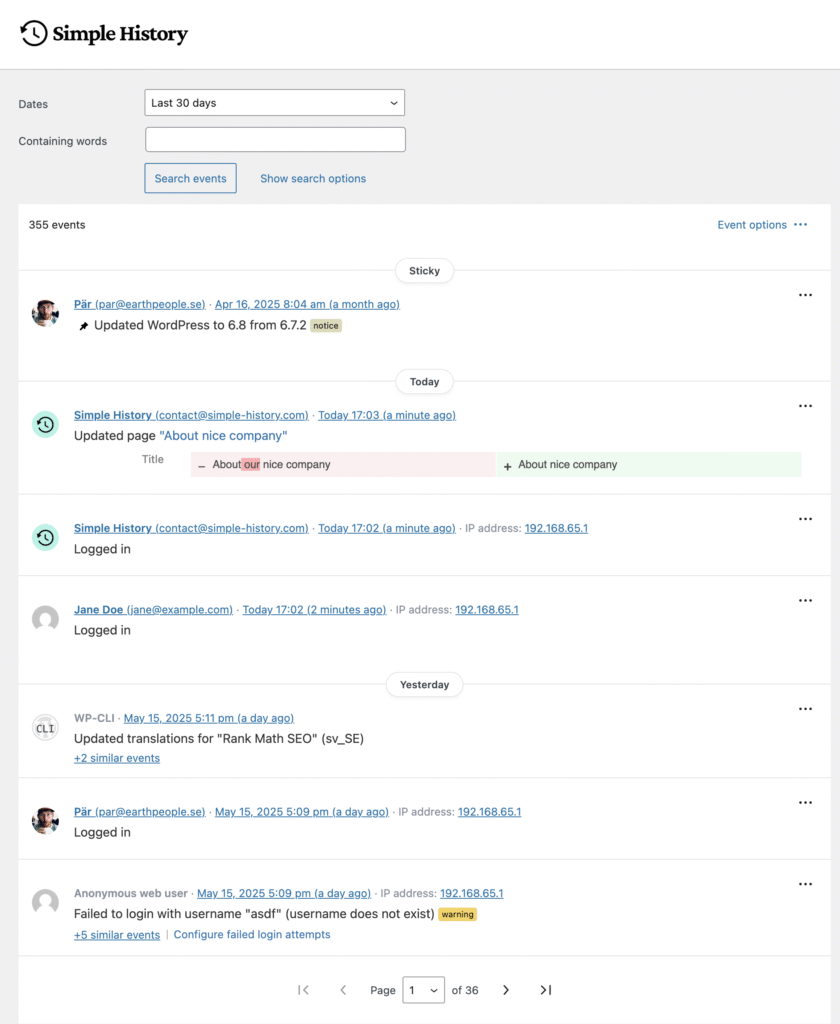 The free version of Simple History was recently updated with support for displaying sticky events added via WP-CLI to the top of the history and this Premium version builds on that features to add support for adding those sticky events using the GUI.