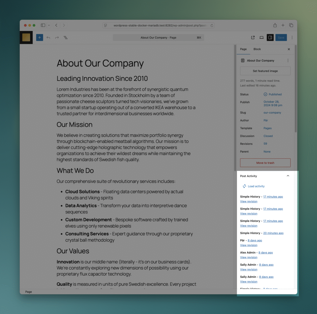 This premium feature adds a sidebar panel to the blog editor when editing posts and pages. In this panel, changes to the current post can be seen, with links to the Simple History event with more details, but also to the built in WordPress revisions.