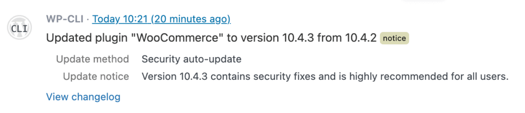 5.23.0 changes that. When a forced security update happens, your log now shows it as “Security auto-update” with the update method clearly labeled. The log level is also elevated from “info” to “notice” so these events stand out when you’re scanning your log.