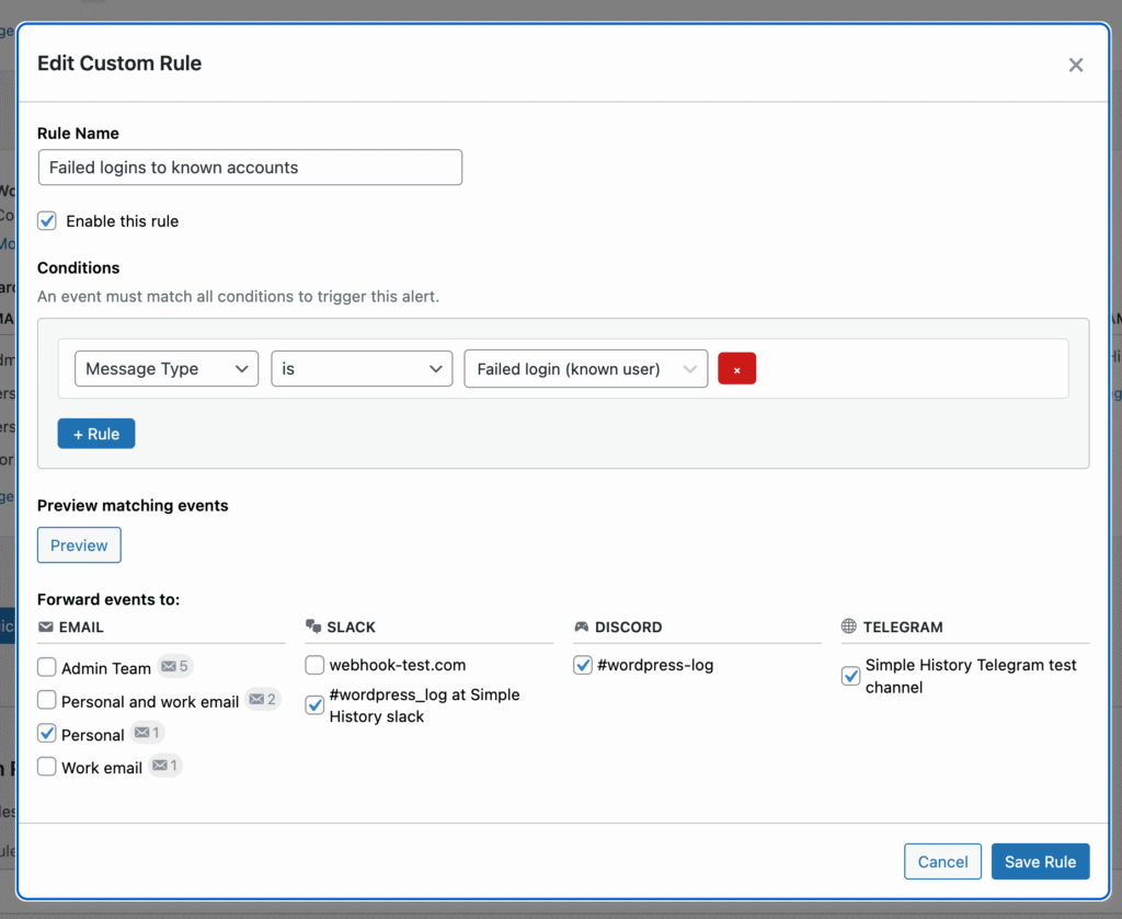 - Search labels on 11 loggers (Beaver Builder, Duplicate Post, Enable Media Replace, Jetpack, Limit Login Attempts, Redirection, User Switching, WP Crontrol, Privacy, Simple History, Translations) for better filtering in alert rules.