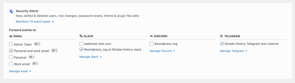 /wp-json/simple-history/v1/stats/notes. - Alerts settings page with premium notification teasers.
