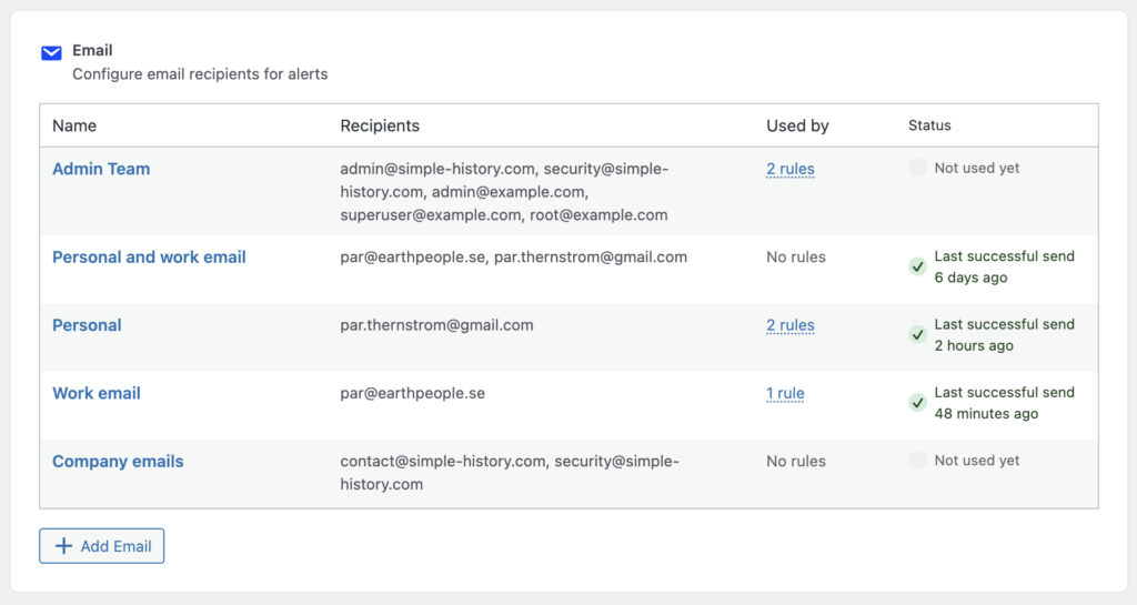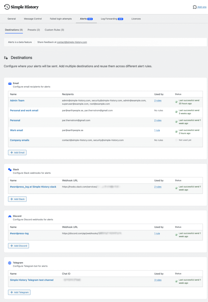 wp simple-history alerts destinations,wp simple-history alerts rules,wp simple-history alerts test. - REST API for alerts at