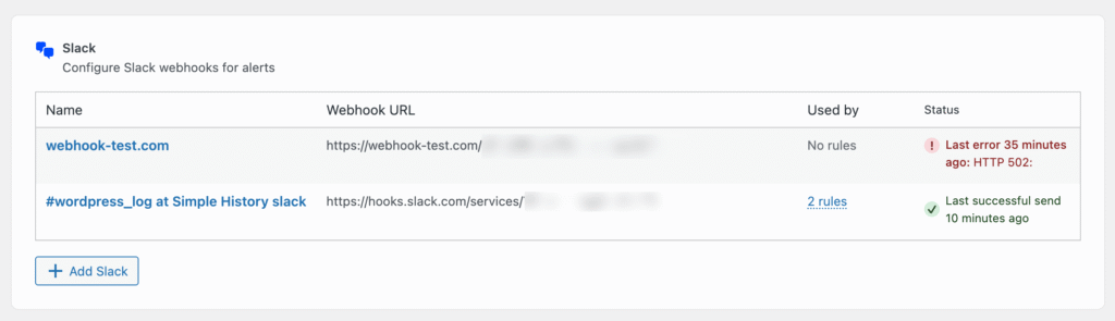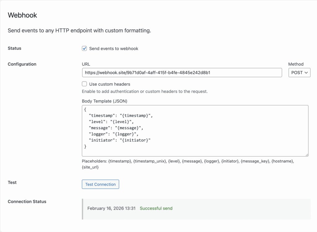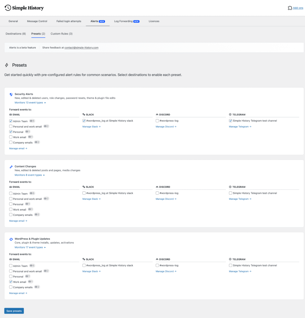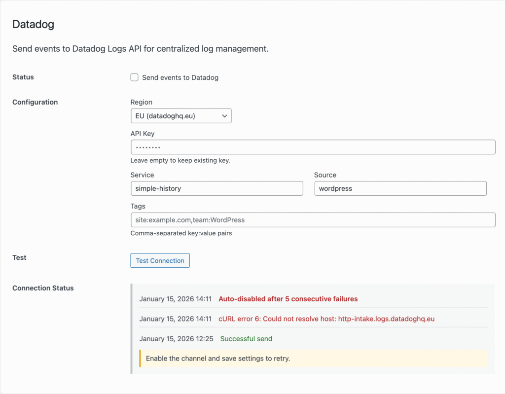 /wp-json/simple-history/v1/alerts/. - Log forwarding: TLS encryption for Remote Syslog, token authentication for Remote Syslog, Datadog channel, Webhook channel, SSL verification toggle, secure credential encryption.