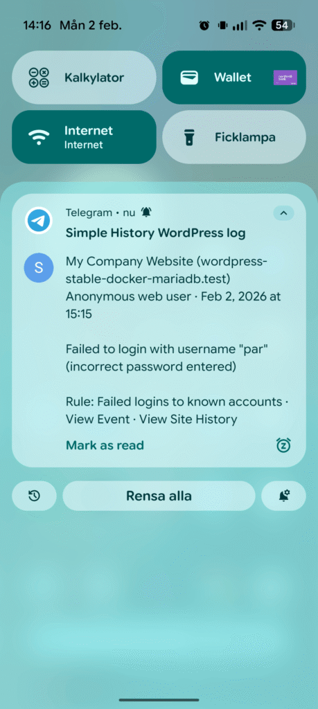 Here is the same event, but this time it’s posted to Telegram, so I will get a push notice on my mobile every time someone tried to login to my user account!